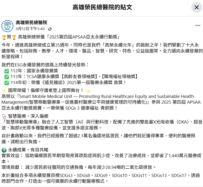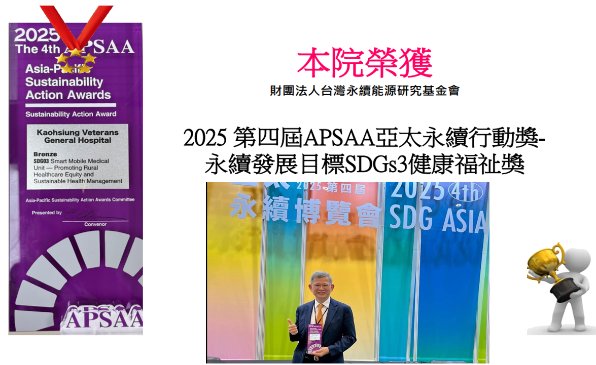 賀~本院榮獲2025 第四屆APSAA亞太永續行動獎永續發展目標SDGs3健康福祉獎 (單位:總務室)