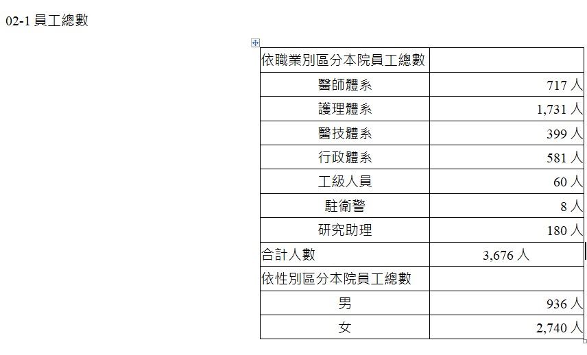 本院為公立醫療機構,員工包含公務人員、契約及臨時人員,分別依據「公務人員任用法」、「聘用人員聘用條例」、「勞動基準法」及「勞動契約書」等相關規定、各類函釋辦理人員進用。在人員進用(遴補)上採公平、公正、公開的方式辦理甄選,擇優錄取;並適時申請高考、普考、特種考試分發或商調優秀公務人員來院服務。人員錄取無分性別、種族、黨派、宗教、婚姻、身心障礙者,員工及主管均為中華民國國民。具公務人員身份員工,受「公務人員保障法」保障,離職原因為自請辭職、退休、升遷或職務異動而離開本院之職位。員工組成依職業別分有醫師、護理師、醫技人員、行政人員、技工工友、駐衛警及研究助理,其中以總院職業佔比前三名為護理人員佔47.09%、醫師佔19.50%及行政人員佔15.81%。勞務承攬外包人員薪資,於簽訂契約內明確要求,承攬廠商應高於法定基本工資。契約人員及臨時人員則受「勞動基準法」及「勞動契約」之保障。在報導期間沒有顯著的員工人數變動。